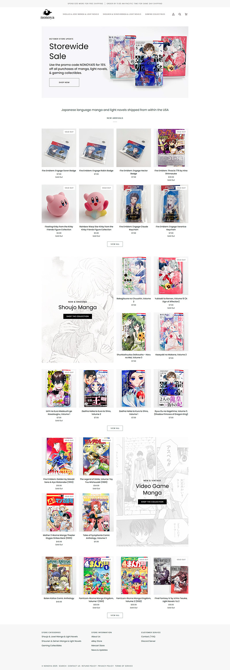 Nonoya Books is a US-based retailer that sells new and vintage Japanese language media including manga, light novels, and video game collectibles. I designed and developed the storefront, wrote product and marketing copy, and created Google and Meta PPC campaigns to increase brand awareness, driving 1.3K average yearly orders.